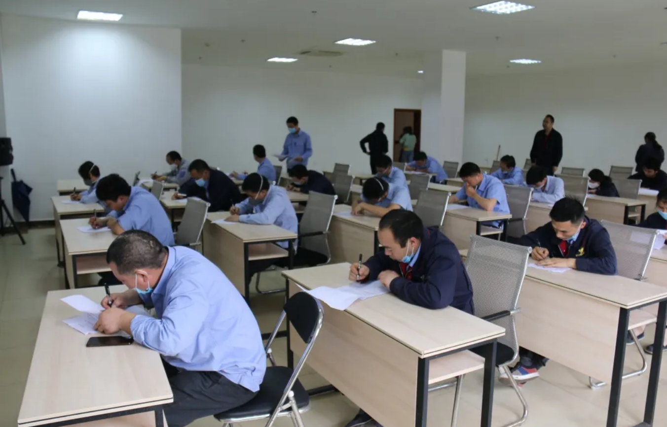 理论知识竞赛现场,参赛选手们拿到考卷后开始进行认真作答。在严肃的氛围中,选手们运笔如飞,快速地在试卷上进行书写,展现自己胸中所学。