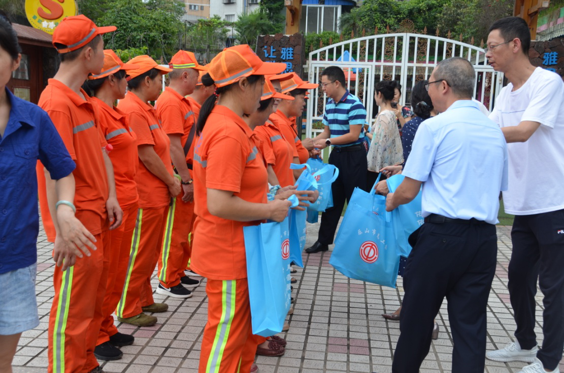 黄国兵诚挚慰问环卫工人代表:“您们辛苦了,感谢您们为乐山城市环境的干净整洁付出的辛勤劳动!尤其是在今年疫情肆虐时,你们坚守岗位、努力工作,为乐山疫情防控和人民健康做出了贡献”。他叮嘱环卫工人们要增强安全意识,遵守安全规程,防止因高温作业引发安全事故,要注意身体和作息时间,确保安全度夏、清凉度夏。