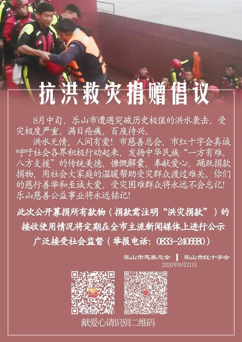 “洪灾无情、人间有爱”,让我们秉承中华民族“一方有难、八方支援”的传统美德,积极行动起来,奉献爱心,善举不分先后,捐赠不分多少,再小的力量也是一种支持。向乐山洪水受灾职工群众家庭伸出援手,踊跃捐款,与灾区职工群众共克时艰,帮助他们度过难关!市慈善总会、市红十字会所接收到的捐款将用于帮助受灾群众度过难关,并及时公示善款接收使用情况,广泛接受社会监督。