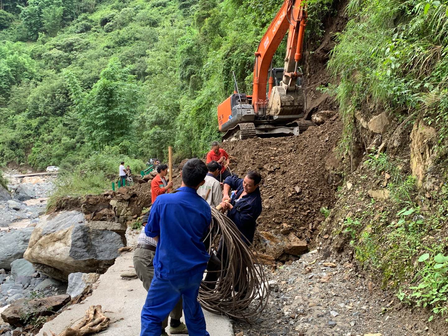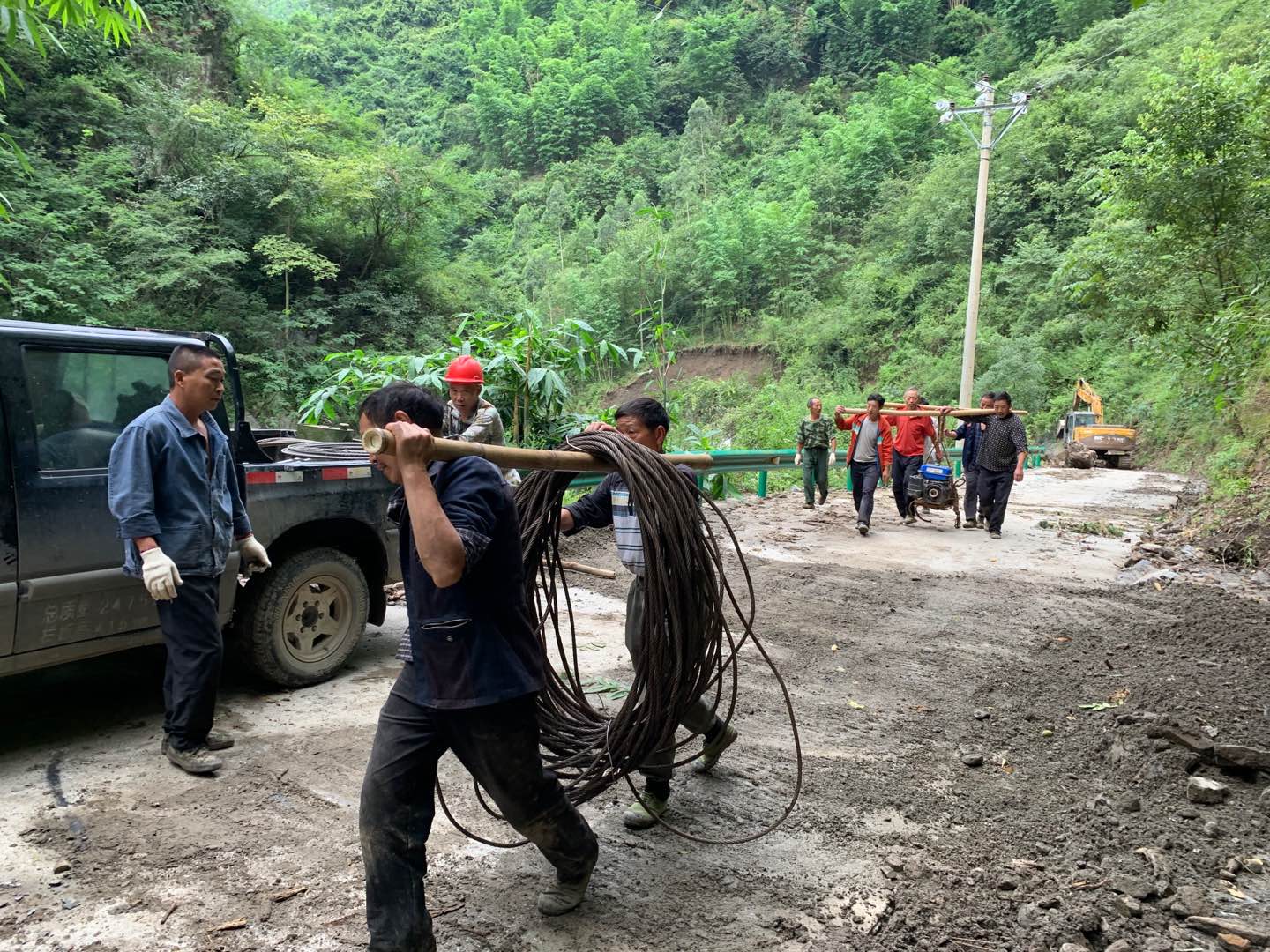 灾情就是命令!人民至上,生命至上!无论多困难,一定要在最短的时间内抢通供电!面对灾情,区委区政府迅速成立了抢险应急组,统筹全区各方资源和优势,充分利用高速、高铁大型机械设备抢通道路,调度乡镇干部和民兵力量,发挥“逢山开路、遇水架桥”的铁军精神,金洋电力与兄弟企业不顾自身电站抢修,而是迅速开展全区抢险保电工作:成立抢险突击队,兵分两路,对乡镇的线路受损情况进行摸排,此次洪灾造成倒杆10处,变电台区冲毁2处,线路受损5公里,最为困难的是多处公路冲毁,道路中断,人员、机械、电杆、导线等无法运输。