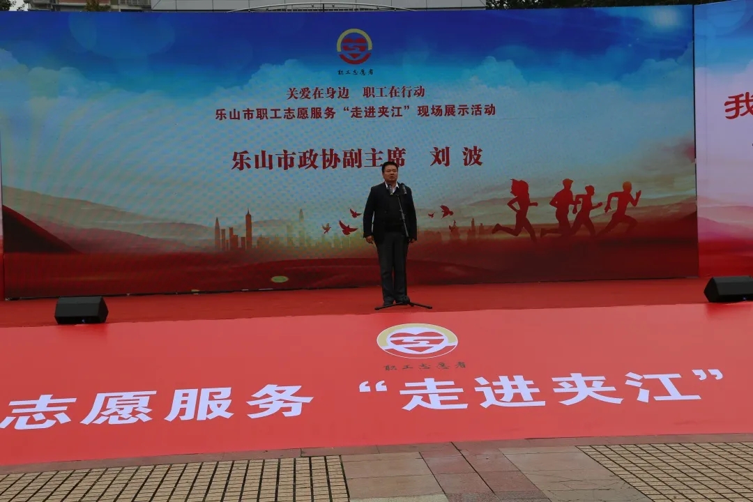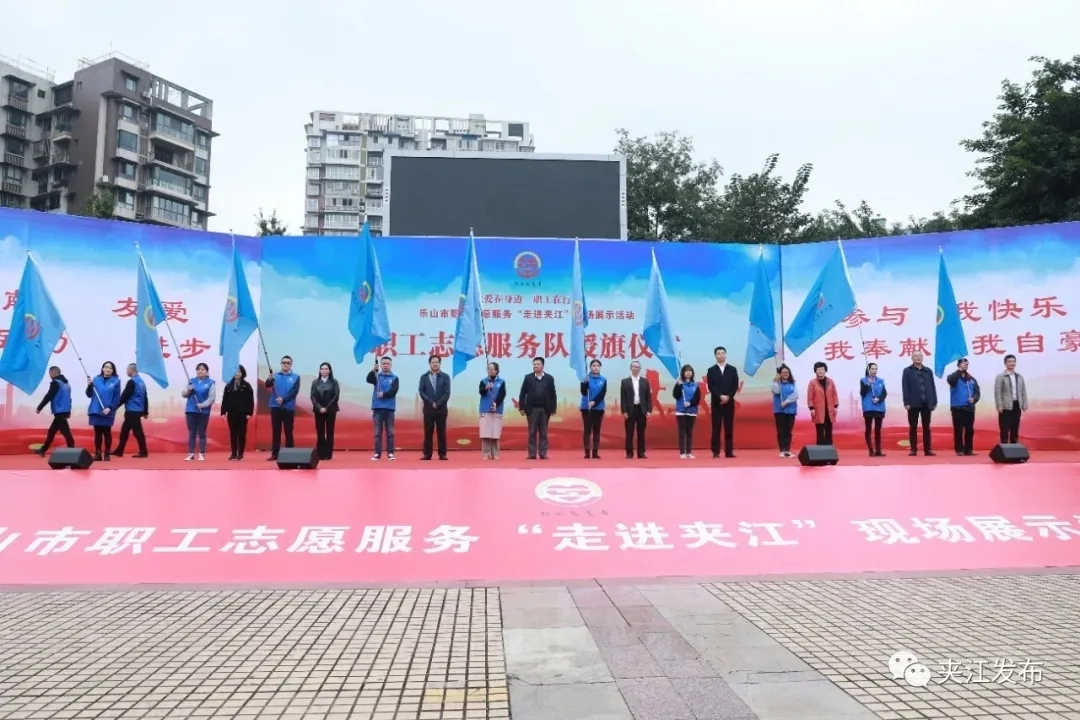 在职工志愿服务队授旗仪式上,与会领导为夹江县漹城街道、青衣街道、新场镇、甘江镇、木城镇、黄土镇、吴场镇、马村镇、华头镇和夹江爱心志愿者职工志愿服务队授旗。职工志愿者代表谢靖宣读了《乐山市深化职工志愿服务倡议书》。