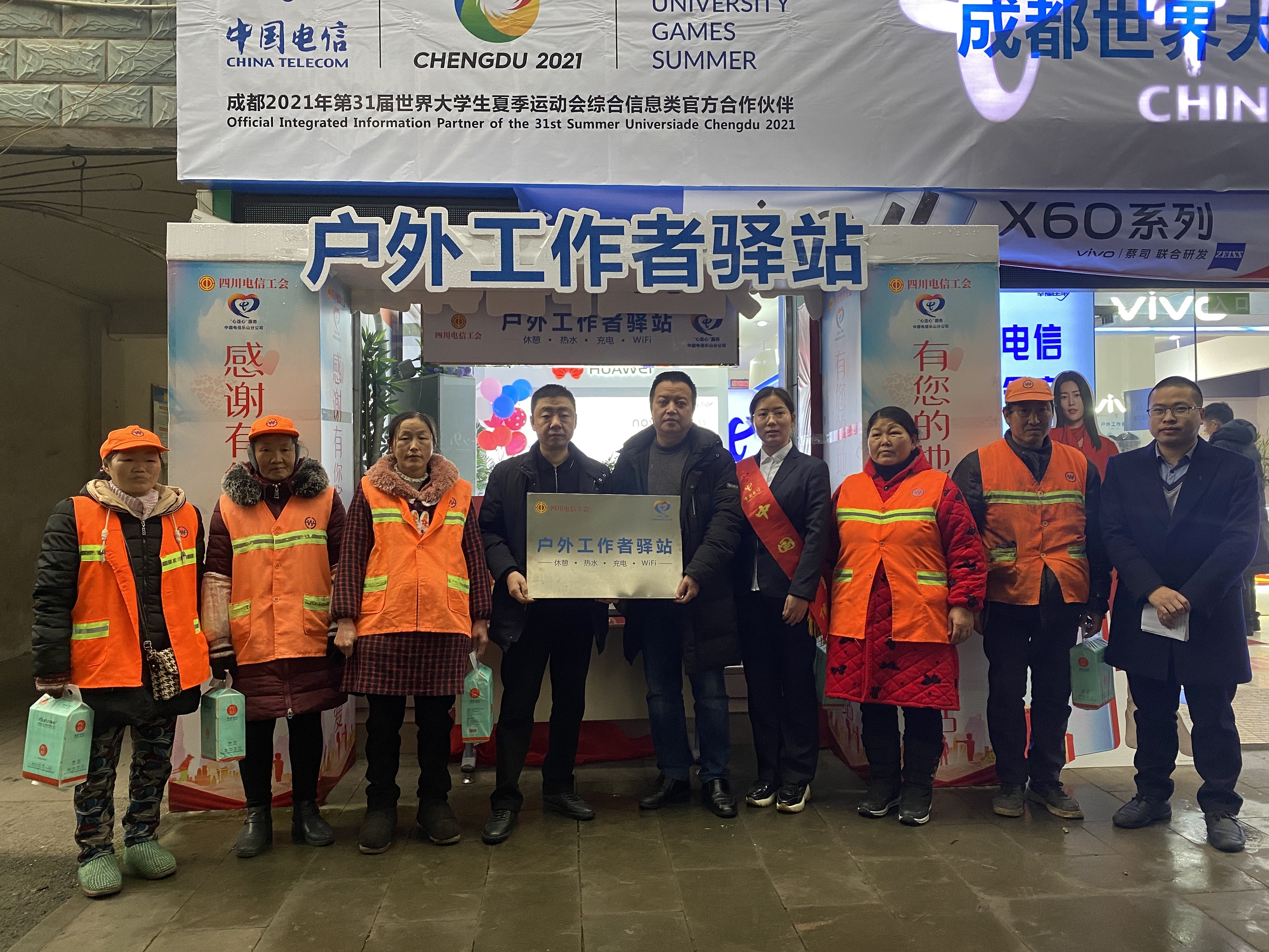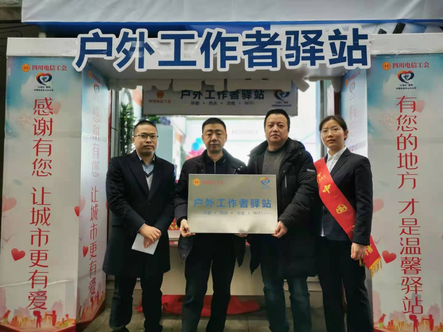 户外工作者驿站由四川省总工会,四川电信共同打造并对全省户外工作者开放。驿站以‘一路文明,一声问候’为主题,有效服务环卫工人,快递员,保洁人员等各类户外工作者,及时把党和政府以及工会组织的关心,关爱送达一线劳动者。户外工作者驿站将长期持续运行。广大户外工作者也将得到便捷,温馨的服务。
