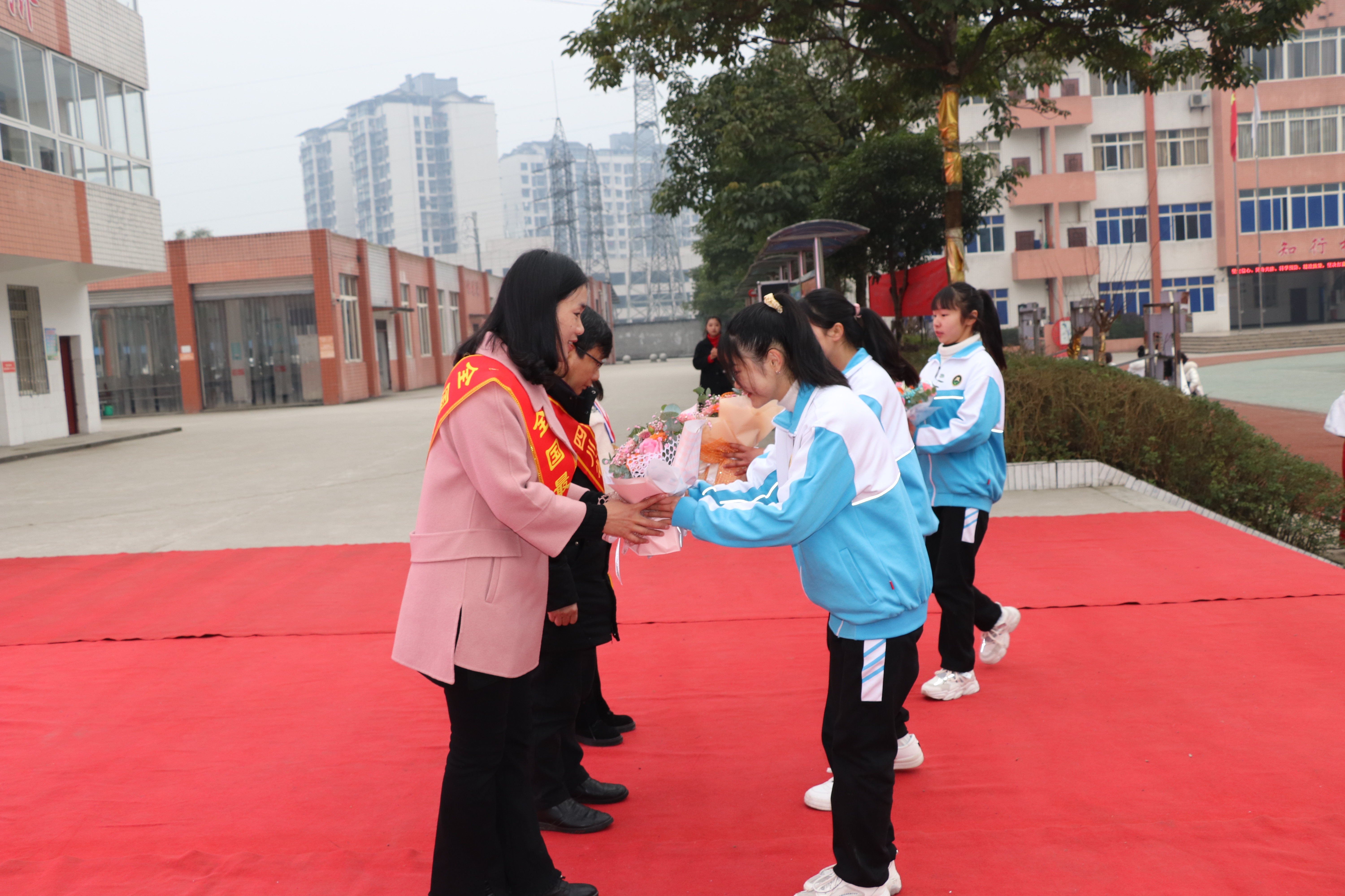学生代表向三位模范敬献鲜花