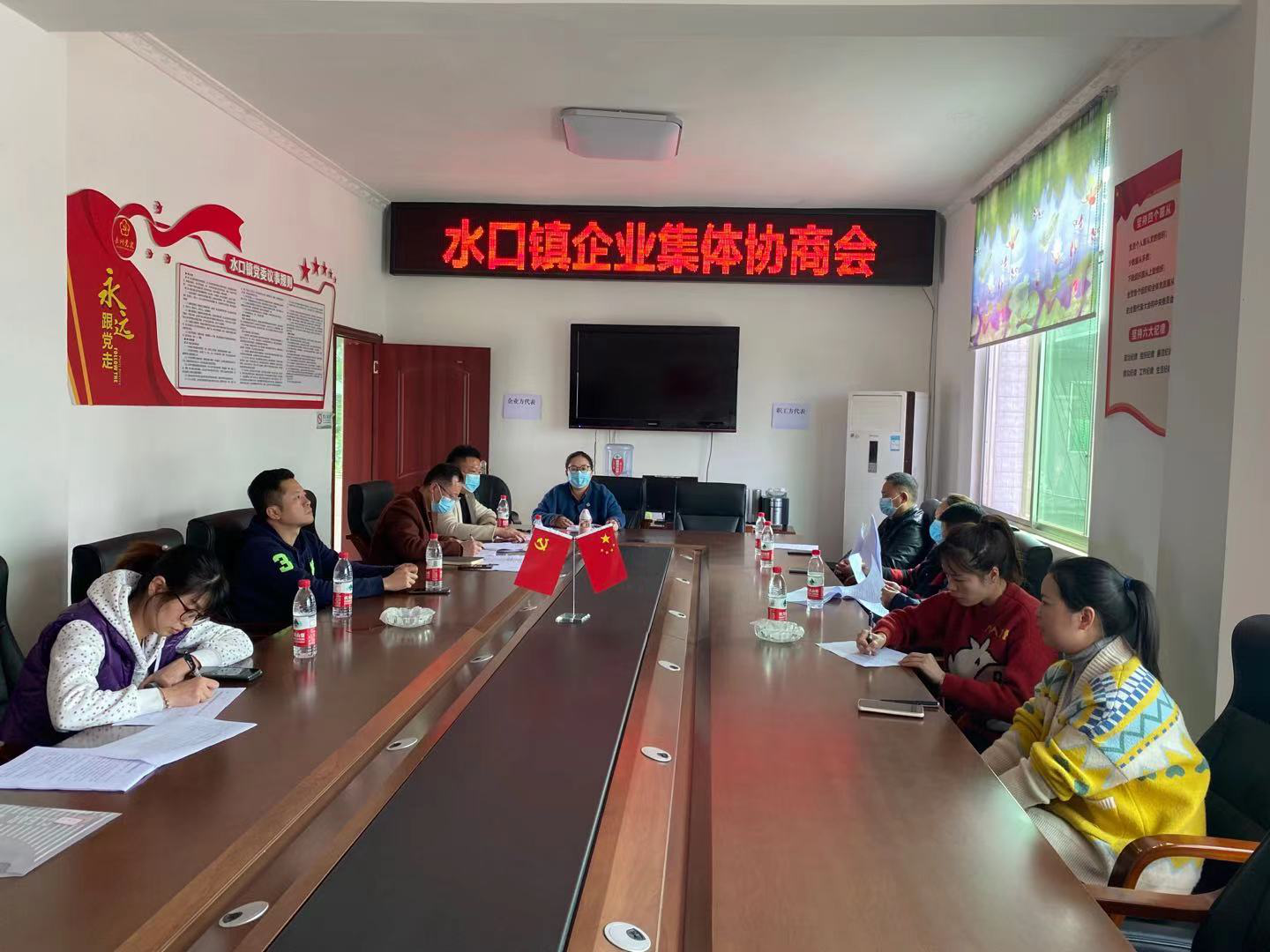 公司职工方首席协商代表,工会主席宿俊飞,职工代表李万军、王惠莲与企业方首席协商代表,总经理、法定代表人李银桔,企业方代表刘星、王公在水口镇政府三楼会议室就《工资专项集体协商合同》、《综合集体合同》进行了协商并达成一致,双方在水口镇政府的见证下,签字仪式获得圆满成功。
