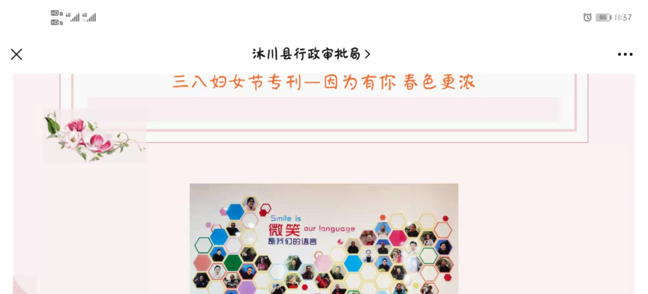 一是开展女职工风采展示活动。以“最美风景在身边”为主题,鼓励全体干部职工“随手拍”“相互拍”记录女职工在工作中的点点滴滴,形成《三八妇女节专刊——因为有你 春色更浓》并在沐川县行政审批局公众号发布。