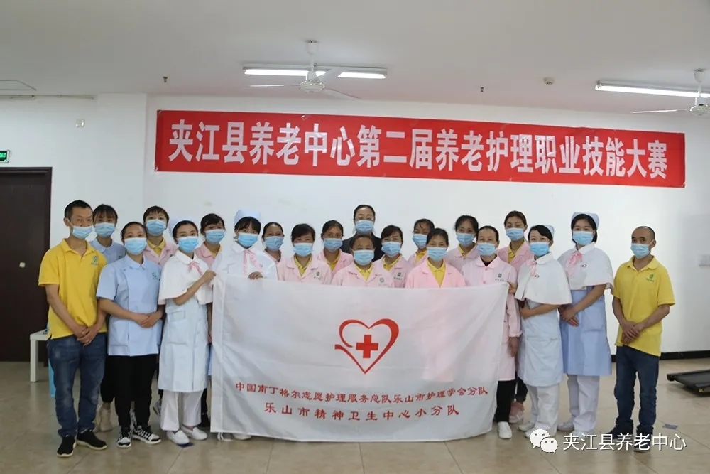 夹江县总工会副主席马文静、县民政局干部宿焕勤、县颐伦养老中心总经理杨莉、工会主席薛兵、业务院长周燕及乐山市第七人民医院护理团到场进行指导。颐伦养老中心15名选手参加大赛开幕式。