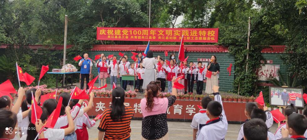 为大力弘扬爱国拥军和志愿服务精神,促进军民鱼水之情,近日,夹江县总工会、夹江县妇联、共青团夹江县委和夹江职工志愿服务队一起走进夹江县二小分校(夹江县特殊学校),和全校师生一起开展庆祝建党100周年“颂党恩 传家风”进特校活动。