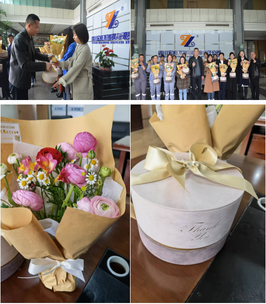 四川宏旺不锈钢有限公司工会为每位女职工购买了一捧鲜花,并邀请公司总经理温志光为每名女职工送花。在合影留念前温志光对全体女职工在工作中彰显巾帼担当、展现巾帼作为表示衷心感谢,希望大家在工作和生活中发挥独特作用,继续做宏旺事业的建设者、做家庭生活的呵护者、做中华复兴伟业的奋斗者,用勤劳双手创造幸福生活,用实干成果书写巾帼佳话。