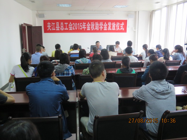 8月27日上午,夹江县总工会在职工培训中心举行2015年“金秋助学金”发放仪式,帮助57名品学兼优、困难职工(农民工)家庭的大学新生顺利走进大学校门,发放助学金9.3万元。