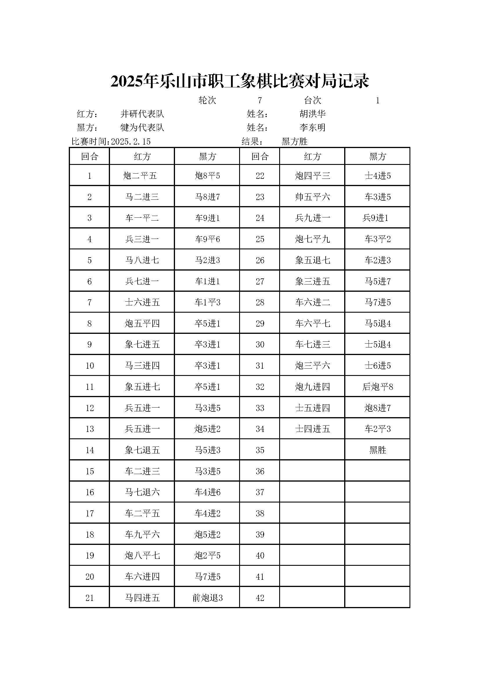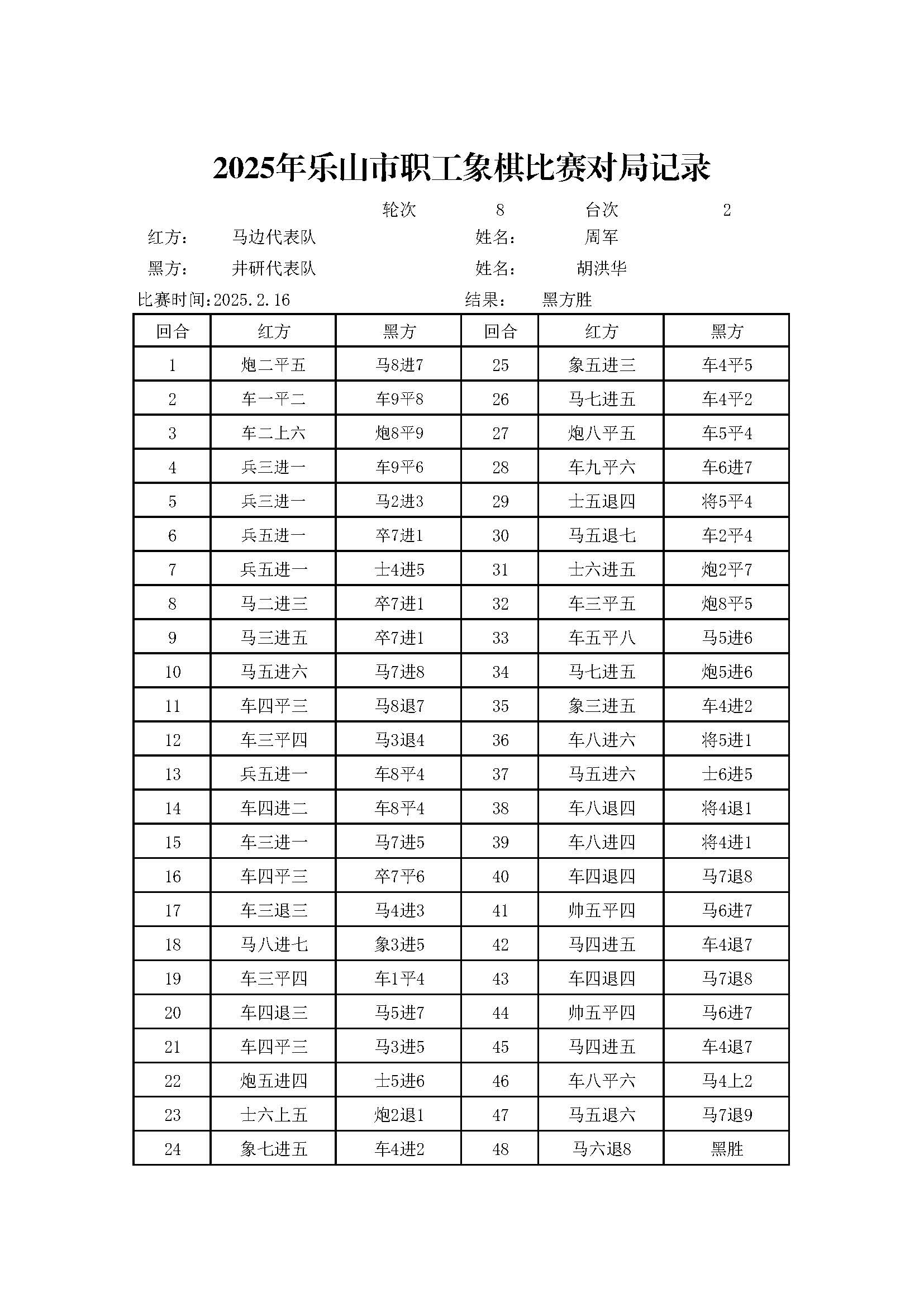 2025年乐山市职工象棋比赛对局记录