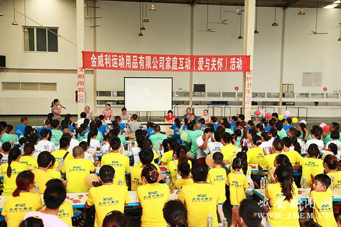 7月26日,峨眉山金威利运动用品有限公司行政与工会联合举办家庭互动(爱与关怀)主题活动,此次活动共邀请100组职工家属与子女一起参与,在活动中员工及家属、子女感受到了大家庭的温馨,促进了家庭和谐。