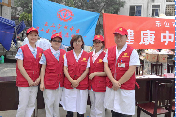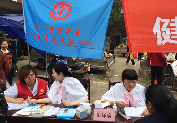 在第106个“5.12”国际护士节即将来临之际,为普及健康知识,提高全民健康水平,增强大众急救意识,乐山市市中区人民医院职工医疗志愿服务队,联合茅桥镇中心卫生院于2017年5月10日在茅桥镇开展了“健康中国,科普助力”为主题的南丁格尔志愿者护理义诊活动。
