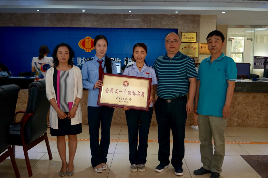 5月27日,乐山市总工会副主席兰宁到五通桥区国家税务局为办税服务厅颁发了“全国五一巾帼标兵岗”荣誉奖牌。