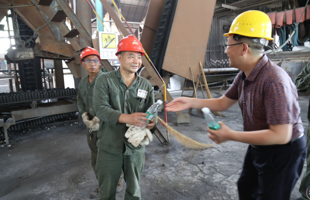 简先林一行先后来到明达集团合金公司、实业公司和运兴电冶有限责任公司深入企业车间,亲临高温作业场所,为冒酷暑战高温的一线职工们递上一瓶瓶解渴的矿泉水,送去工会“娘家人”暖心的关怀。炎炎夏日里,工会的“送清凉”给职工们带去了丝丝凉意,使高温作业一线职工感受到了工会组织的温暖关心。
