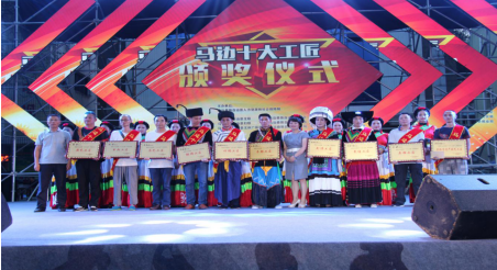 王嘉骏、周启梅共同向非物质文化遗产技艺工匠旦者木来、石雕工匠冯建、裁缝工匠吉耍牛牛、刺绣工匠曲别李英、木雕工匠曲模达能、竹编工匠曲模拉日、银饰工匠李转布、茶艺工匠李贤波、书画工匠张涛、厨艺工匠徐伟颁奖。
