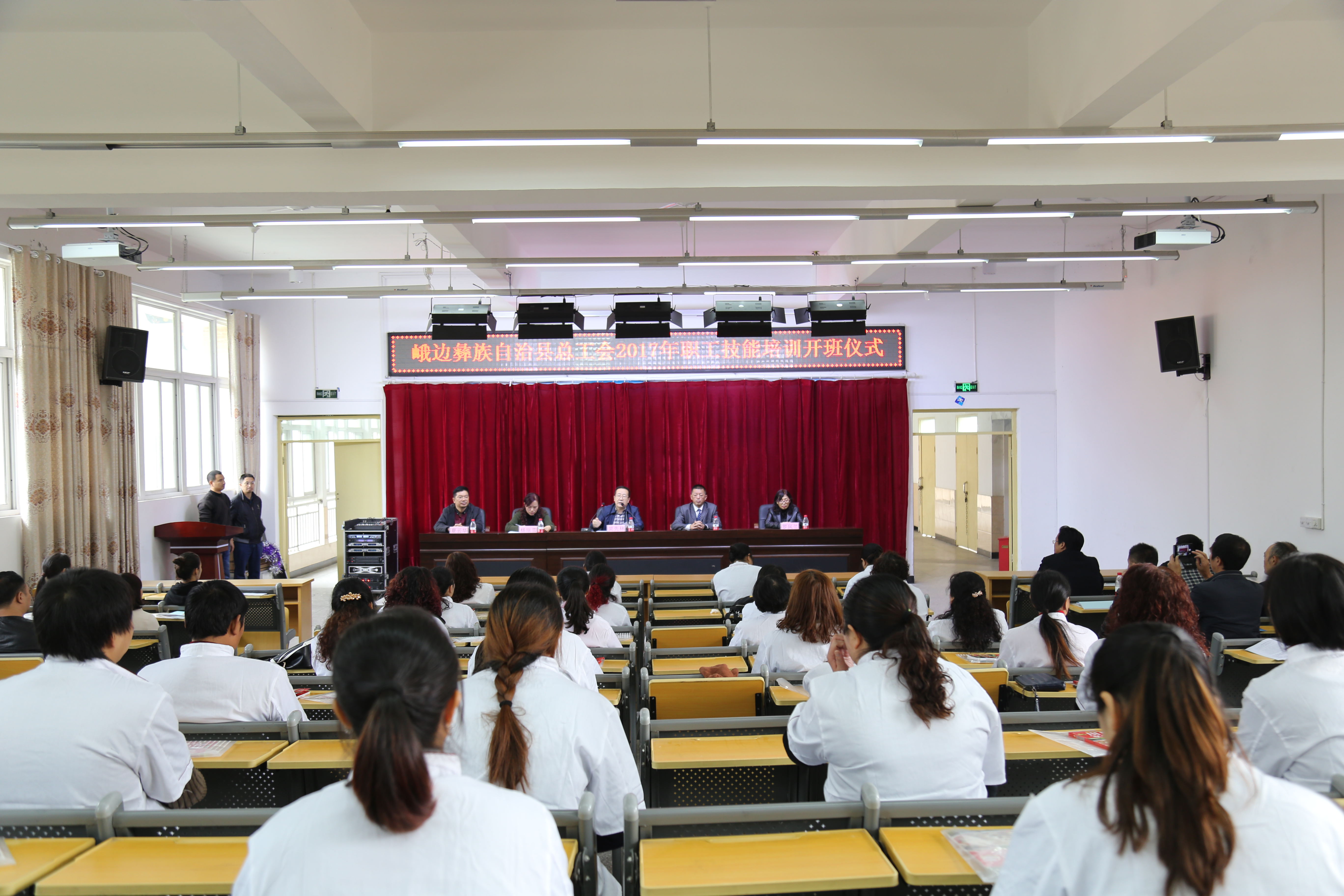 10月23日上午10时,由峨边县总工会主办,峨边职业高级中学承办的2017年职工技能培训班,在峨边职业高级中学举行开班仪式。县委常委、县总工会主席简先林,峨边职业高级中学副校长古强,县总工会经审主任杨瑞雪,县职教中心培训处主任夏云华,县总工会全体干部,部分企业工会负责人,县职教中心部分老师,以及100名培训学员参加本次开班仪式。开班仪式由县总工会经审主任杨瑞雪主持。