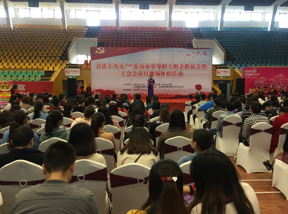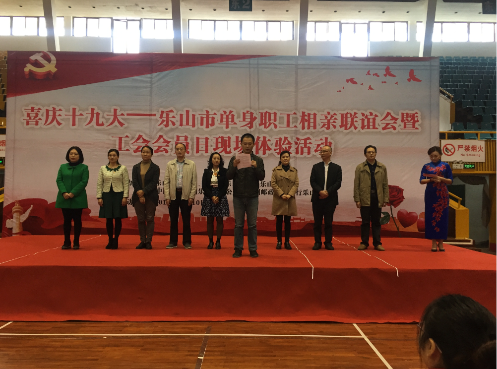 为学习贯彻党的十九大精神,积极搭建单身职工交友相亲桥梁平台,进一步加强工会会员普惠性服务工作宣传,增强群团组织吸引力、凝聚力、影响力,11月10日,由乐山市总工会牵头,联合团市委、市妇联、市邮政公司、市邮储银行等部门在市体育馆共同举办“喜庆十九大——乐山市单身职工相亲联谊会暨工会会员日现场体验活动”。四川省总工会保障部副部长张骁出席活动并致辞,乐山市总工会、团市委、市妇联市邮政公司相关领导出席。乐山高新区工会负责人,市中区总工会、邮政分公司、邮储银行支行负责人及工作人员,单身职工、工会会员代表,职工、青年志愿者等400余人参加活动。