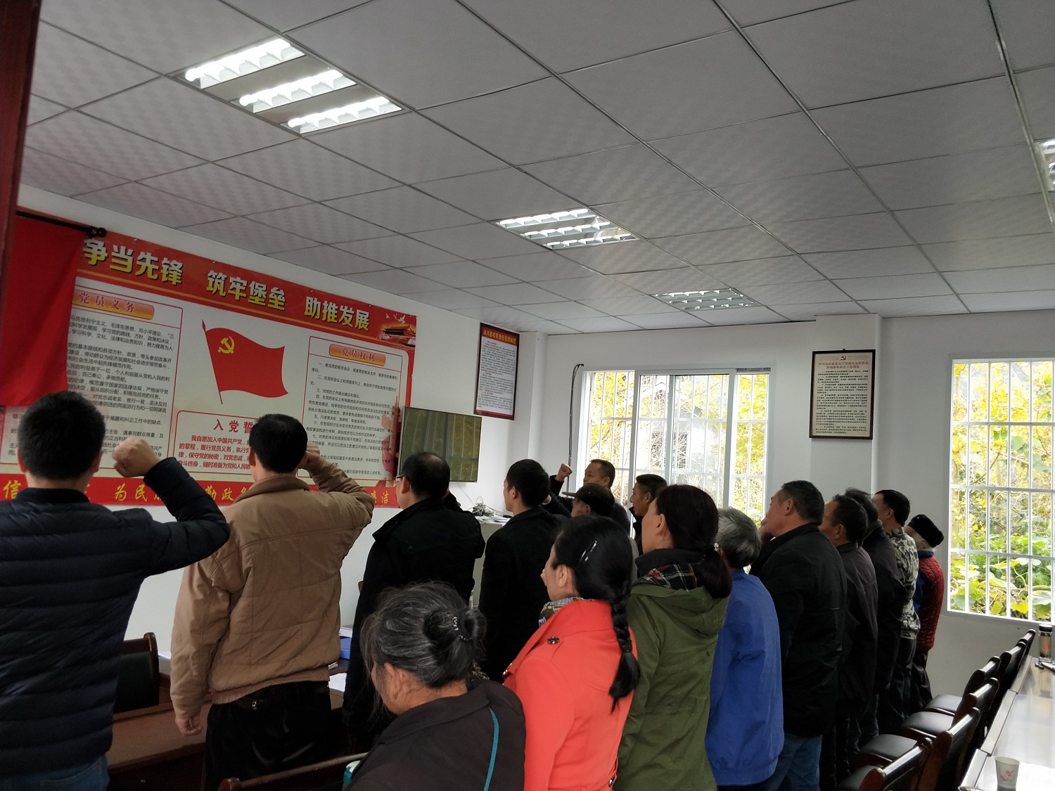 近日,县总工会全体党员深入到所联系帮扶的茨竹乡雄心村,结合脱贫攻坚工作,围绕学习十九大精神、学习党的历史,进一步深化“党建扶贫牵手”行动,与两村党员干部集中开展了主题党日活动,切实把党员干部群众的思想和行动统一到党的十九大精神上来。活动中,全体党员干部一同观看了习近平总书记带领中央政治局常委瞻仰上海中共一大会址和浙江嘉兴南湖红船的电视视频,认真学习习近平总书记在瞻仰活动后发表的重要讲话精神;全体党员在党旗下一起重温入党誓词,回顾党的历史;县总工会常务副主席余洪元同志就学习贯彻党的十九大精神作了精彩宣讲,引导党员干部增强“四个意识”,继续保持不忘初心、担当尽责的事业心责任感,在决胜脱贫攻坚的实践中发挥先锋模范作用。