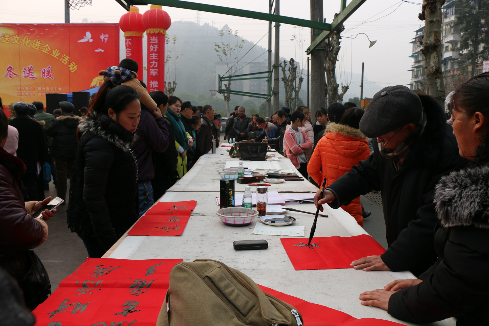 在文艺演出进行的同时,来自县老年书画研究会的书画家们还现场挥毫泼墨,为嘉阳集团广大职工作画50余幅、送出春联100多对,为企业送来丰盛的精神食粮,向职工传递美好的祝愿,深受大家的欢迎。