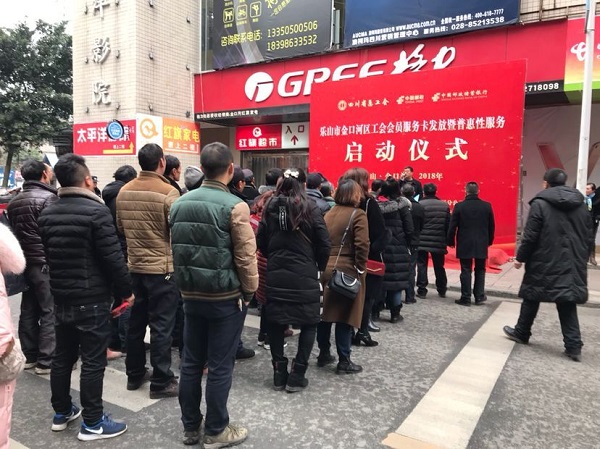 2018年1月31日,由金口河区总工会联合区邮政分公司、邮储银行峨边县支行共同承办,金口河区普惠性服务签约商家协办的金口河区工会会员服务卡发放暨普惠性服务启动仪式在红旗超市门口举行。金口河区委常委、统战部部长、工会主席王兴华,中国邮政集团金口河区分公司总经理张利和,出席仪式并讲话,区总工会常务副主席赵志、中国邮政储蓄银行峨边支行行长范中兴、金口河区部分机关企事业单位工会和乡镇工会联合会代表,金口河区首批发卡工会会员代表参加仪式。