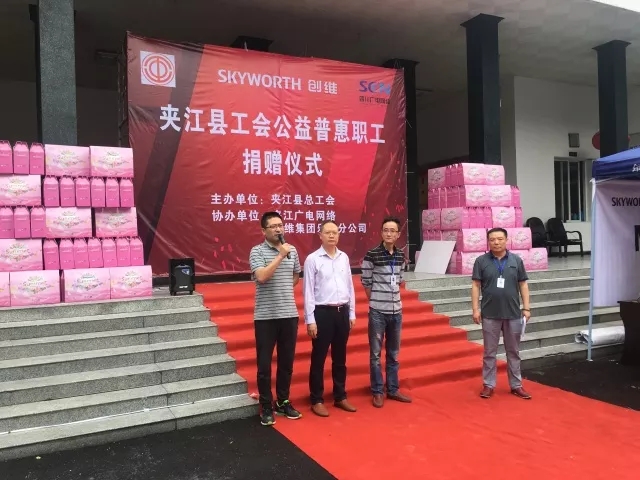 捐赠现场,夹江县总工会负责人出席仪式并讲话;创维集团乐山眉山片区负责人介绍了公司推进职工普惠服务工作取得的成效;四川广电网络夹江分公司负责人致辞。