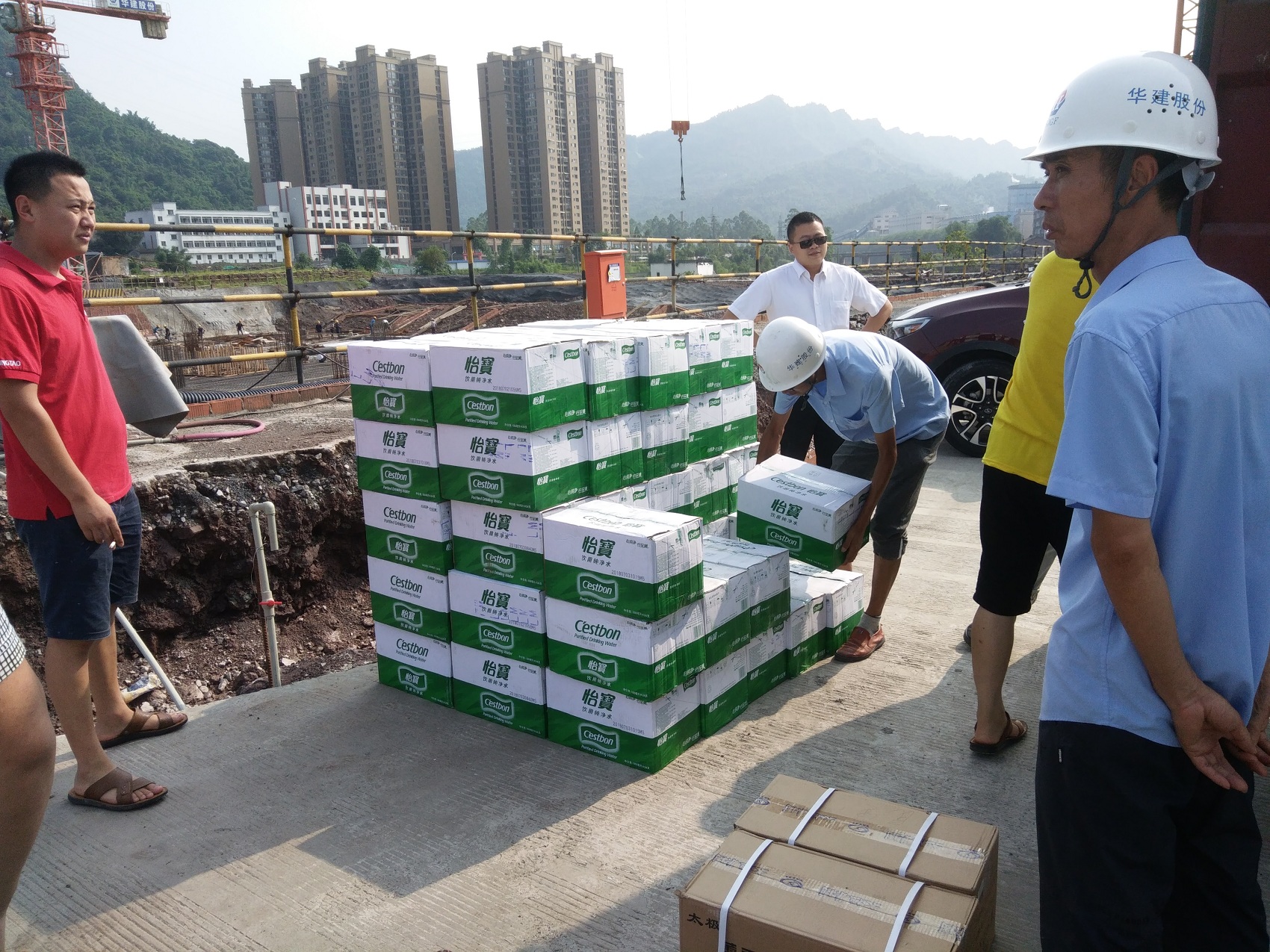 金石集团车间工人正在帮忙搬运清凉物资