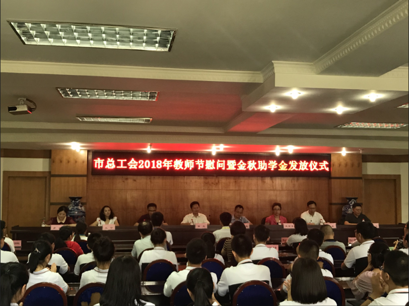 9月3日,乐山市总工会在乐山第一中学校,举行2018年教师节慰问暨金秋助学金发放仪式。市委副书记、市总工会主席田文,市委副秘书长刘才能,市教育局局长陈昆、市总工会常务副主席王学东,市总工会副主席兰宁,市教育基金会理事长李金文、市商业银行工会主席尹麟、乐山第一中学校校长林毅出席仪式。中心城区部分受助困难学生代表,受慰问的部分优秀教师代表等共200多人参加仪式。发放仪式由市教育局局长陈昆主持。
