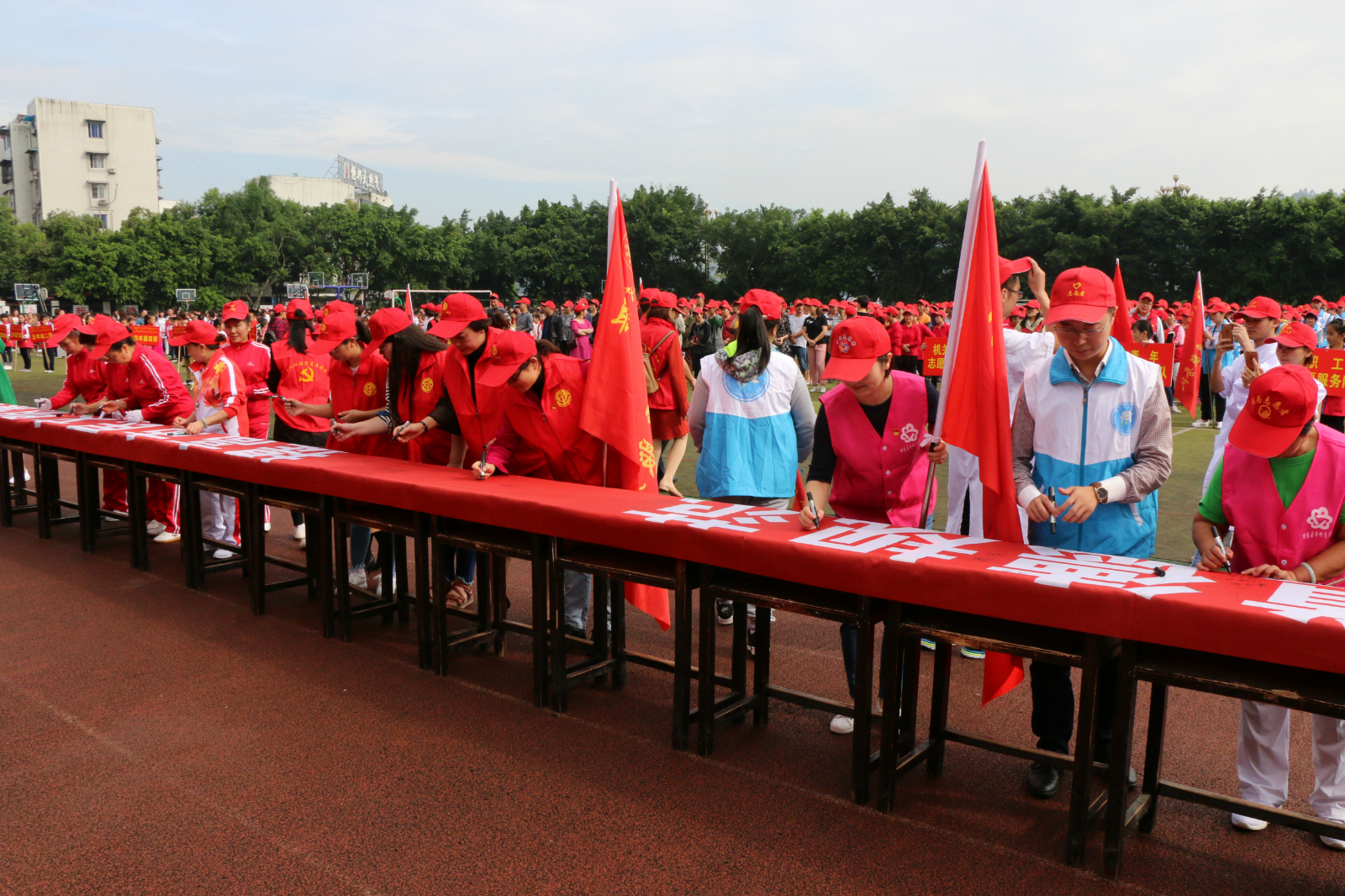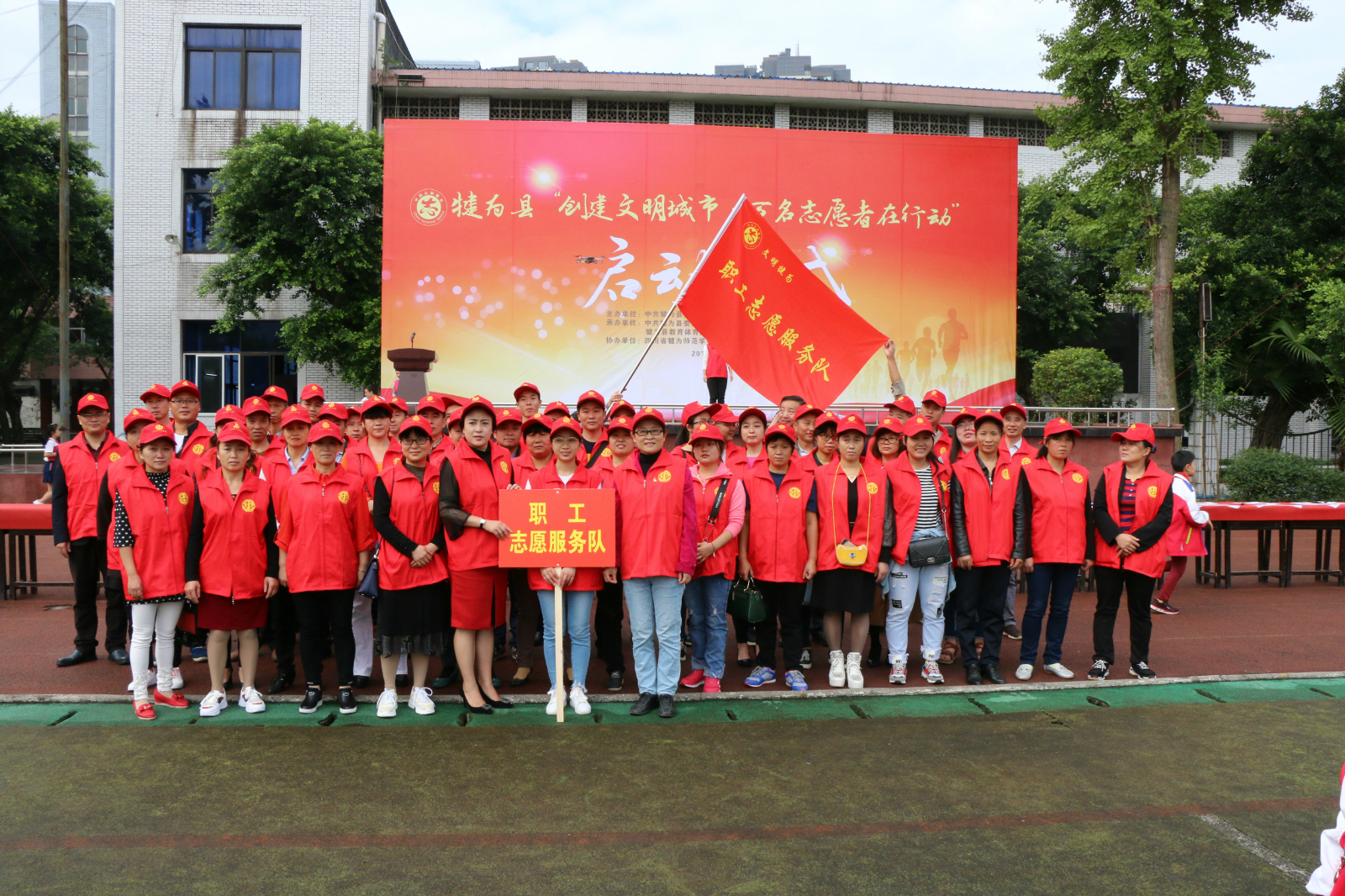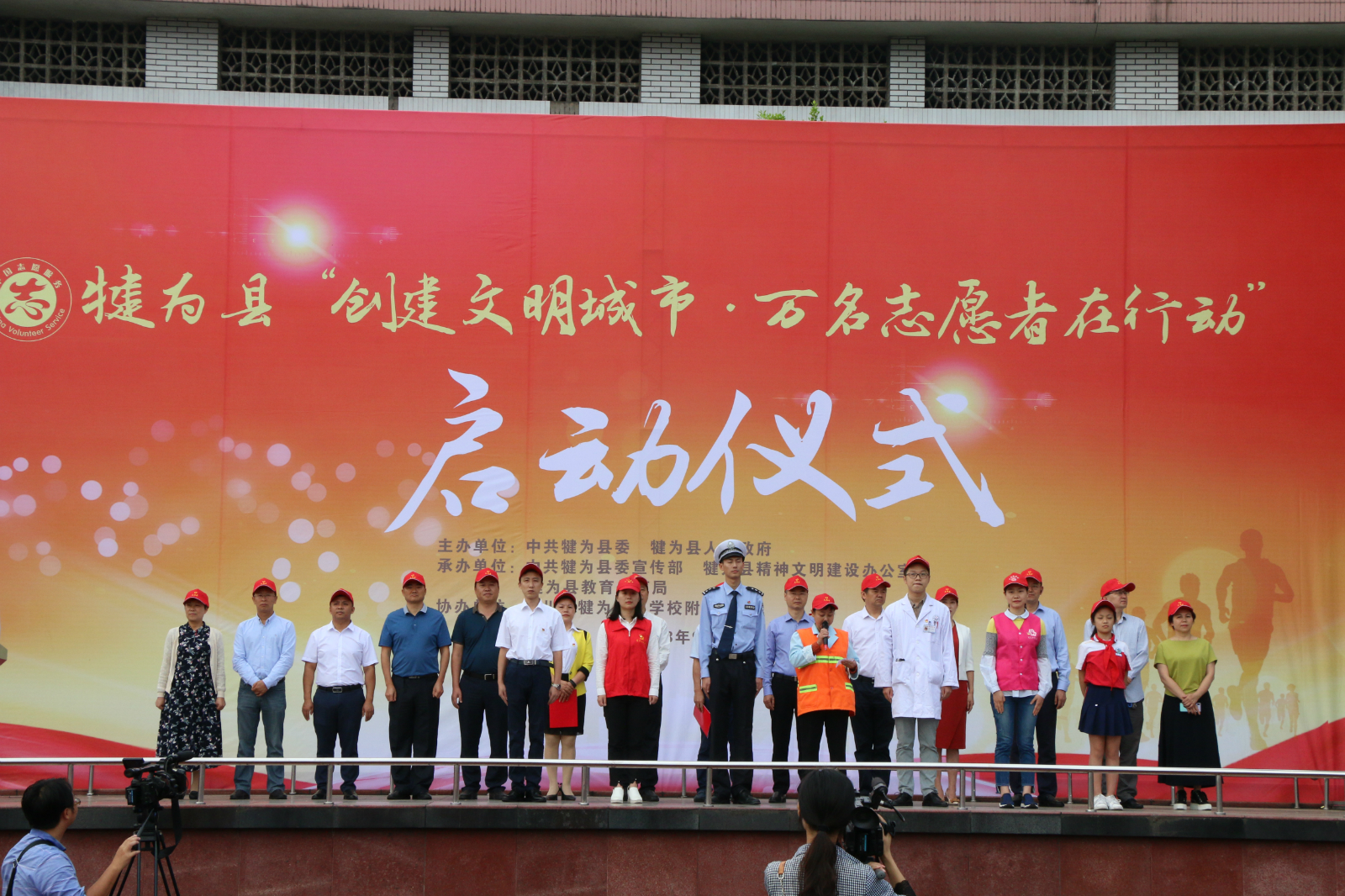 启动仪式设犍为外校、犍为二中、犍师附中、南门小学、新城小学、犍为职中6个分会场。14支行业志愿者代表队以及城区各中小学校师生,共计1万余人参加仪式。