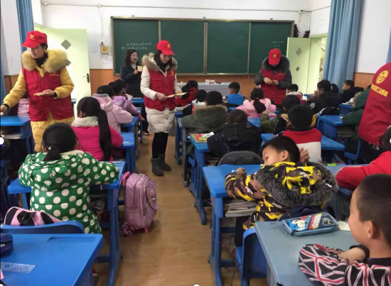 职工志愿者向农村留守儿童分发明信片