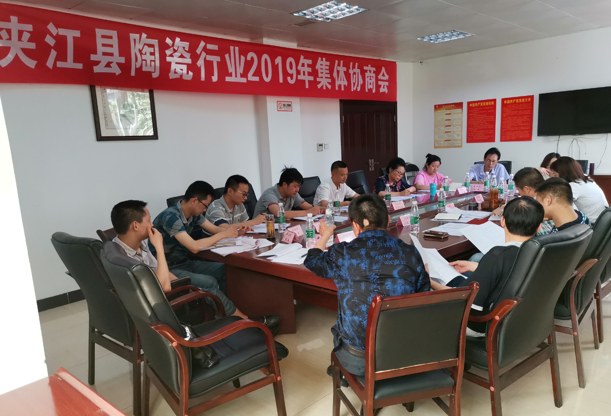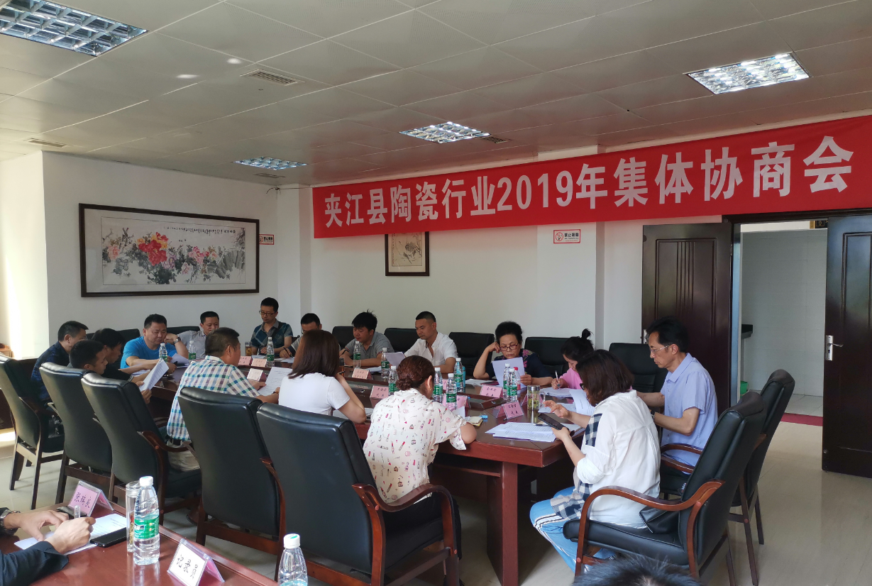 2019年4月25日下午,夹江县陶瓷行业工会联合会举办的夹江县陶瓷行业2019年集体协商会在夹江县总工会二楼会议室隆重召开,夹江县陶瓷企业行业协会作为集体协商的应约方参加协商会,四川省总工会、乐山市总工会集体协商指导员张瑞良应邀现场指导工作,夹江县总工会、夹江县人社局、夹江县工商联相关负责同志列席会议。
