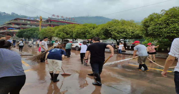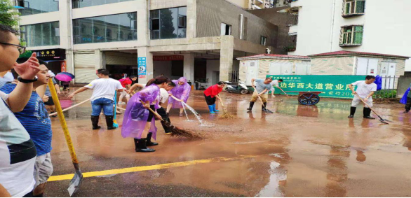 清淤现场组织有序,有人负责冲淤泥,有人负责铲淤泥,有人负责扫污水,有人负责倾倒淤泥。全体干部职工冒雨积极投入抗洪抢险清淤工作中,尽管雨水和汗水湿透了衣服,大家浑然不顾,用实际行动践行共产党员的基本职责。