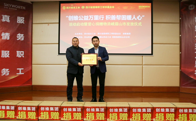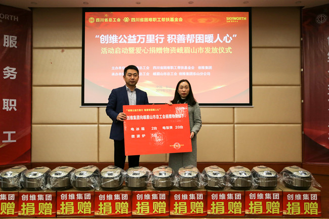 仪式现场,深圳创维集团四川分公司为峨眉山市有购买创维家电需求的职工提供了“乐山市长专项补贴卡”6500张,总价值300余万元,创维集团乐山分公司向峨眉山市困难职工捐赠了智能电饭煲、冰箱、微波炉等物资。