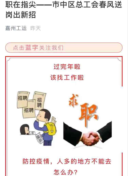 二是平台转换,确保信息要对称。由召开现场招聘会张贴企业招聘简章面对面选择转换为招聘信息通过网络发到镇街、村组和社区网格再宣传到求职者,并在区人才网、嘉州工运、区人社局、市中区新青年等微信公众号及相关媒体平台投放,奋力确保了求职者信息对称。