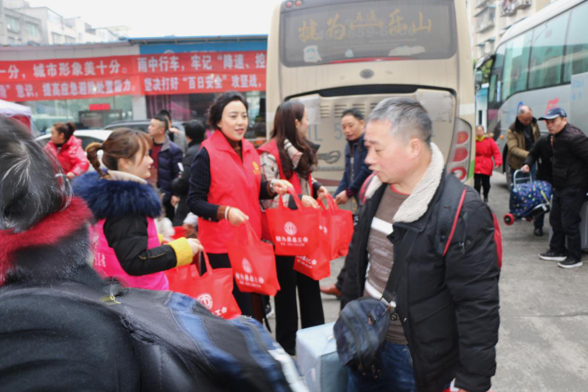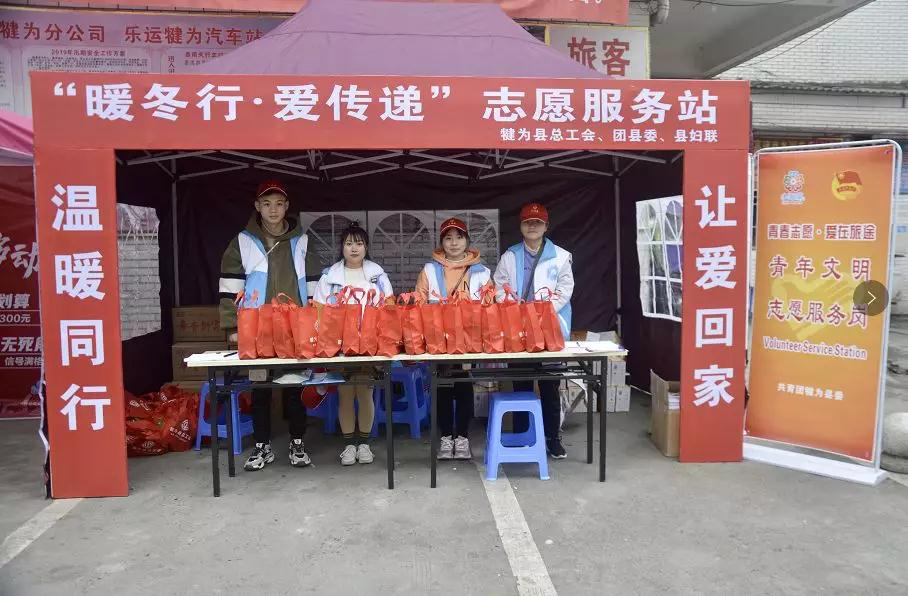 犍为县总工会、团县委、县妇联在乐宜高速犍为北出口、犍为客运中心站、成贵高铁犍为站分别设立暖冬行动志愿服务站,组织职工志愿者、青年志愿者以及巾帼志愿者为返乡农民工送上一杯热水、一盒牛奶、一些葱油饼,让舟车劳顿的他们一下车就能感受到亲人般的温暖;喝上一口热水,吃上一口葱油饼,一下子感受到了家乡的味道。同时,还发放了《劳动法》《工会法》《女职工权益保护法》等劳动保障法律法规宣传资料,依托志愿服务站开展职工帮扶、法律维权、农民工权益维护等的宣传工作,为农民工做好返乡最后一站的服务,把县委、县政府的关怀和工会组织的温暖送到了农民工心坎上。