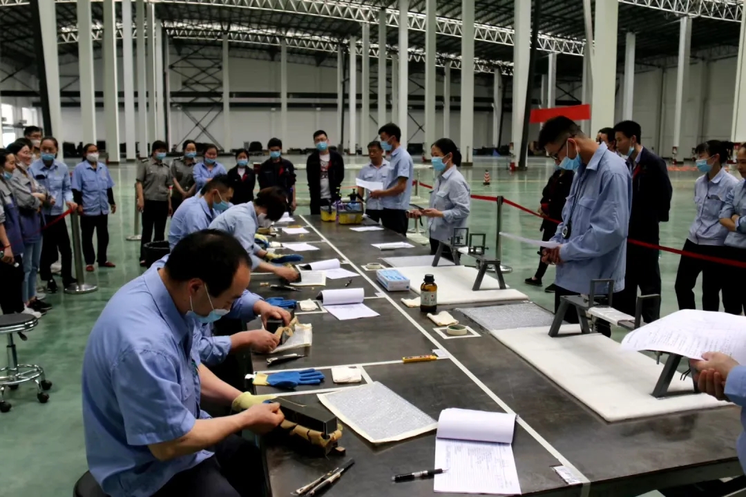 本次技能比武共设两个正式比赛项目,分别为理论知识竞赛与实际操作,其中,实操比武由打预抽袋、肋类零件铺叠、零件脱模、切割技能、叉车操作五项个人核心技能组成。评委组根据理论成绩与实操成绩,以3:7比例综合计算总成绩,评选出每个工种的冠军。来自四川省新万兴碳纤维复合材料有限公司各个复材车间各个工段的35名名职工选手参加了本次技能比武。