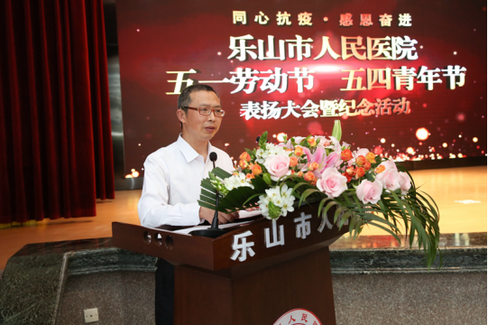 4月30日,乐山市人民医院举行“五一”国际劳动节、“五四”青年节庆祝暨表扬大会。市总工会党组书记、常务副主席黄国兵,团市委书记令狐雅出席会议。医院在家院领导、中层干部、职工代表、团员青年代表和受表彰人员300余人参加会议。会议由医院党委副书记金锋主持。