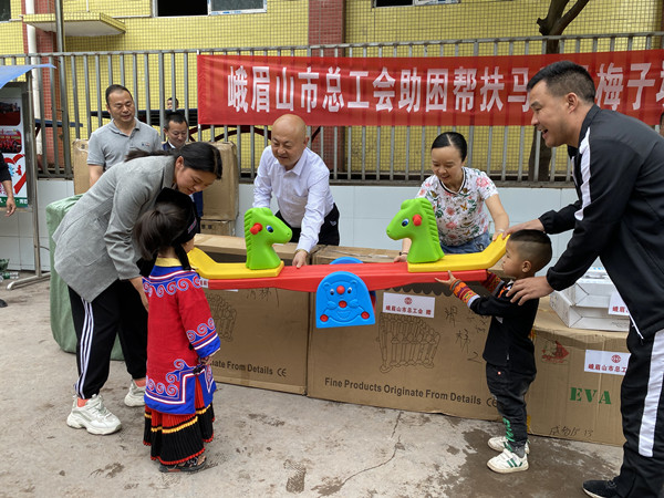 为进一步贯彻落实市委市政府关于对口帮扶马边的决策部署,5月28日,峨眉山市总工会主席吴利平带领市总工会扶贫工作队前往马边,以教育扶贫和就业帮扶为重心,开展扶贫济困工作,为马边送去5万余元的扶贫物资。吴利平一行来到马边梅子坝小学和幼儿园,向该校全体学生致以节日的问候,向为少年儿童健康成长付出辛苦的广大教师表示亲切慰问,并学校送去了电脑、校园体育器材和幼儿玩具等,同时希望孩子们健康快乐成长,在家成为好孩子,在学校成为好学生,认真学习本领,掌握更多的知识,长大后多为家乡发展做贡献。
