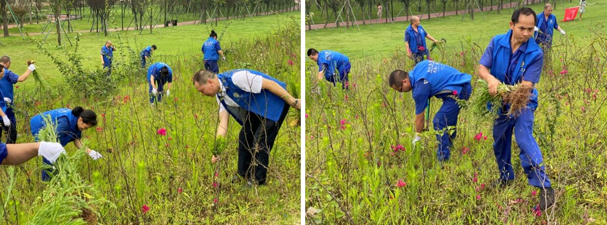 活动中,夹江“工会蓝”纷纷戴好手套、随带镰刀与口袋来到青衣江生态廊道,对近百米绿化带内的杂草和垃圾进行清理。炎热的天气中,大家分工负责,挥汗除草,不怕脏和累,整个劳动场面热火朝天,有的用除草工具将杂草连根除去,有的用手把草连根拔起,一切都有条不紊地进行。蓝天白云下,悠悠青衣江边,长长的绿化带中,“夹江职工志愿服务队”彩旗迎风飘舞,“工会蓝”挥汗如雨,形成一道靓丽的风景。