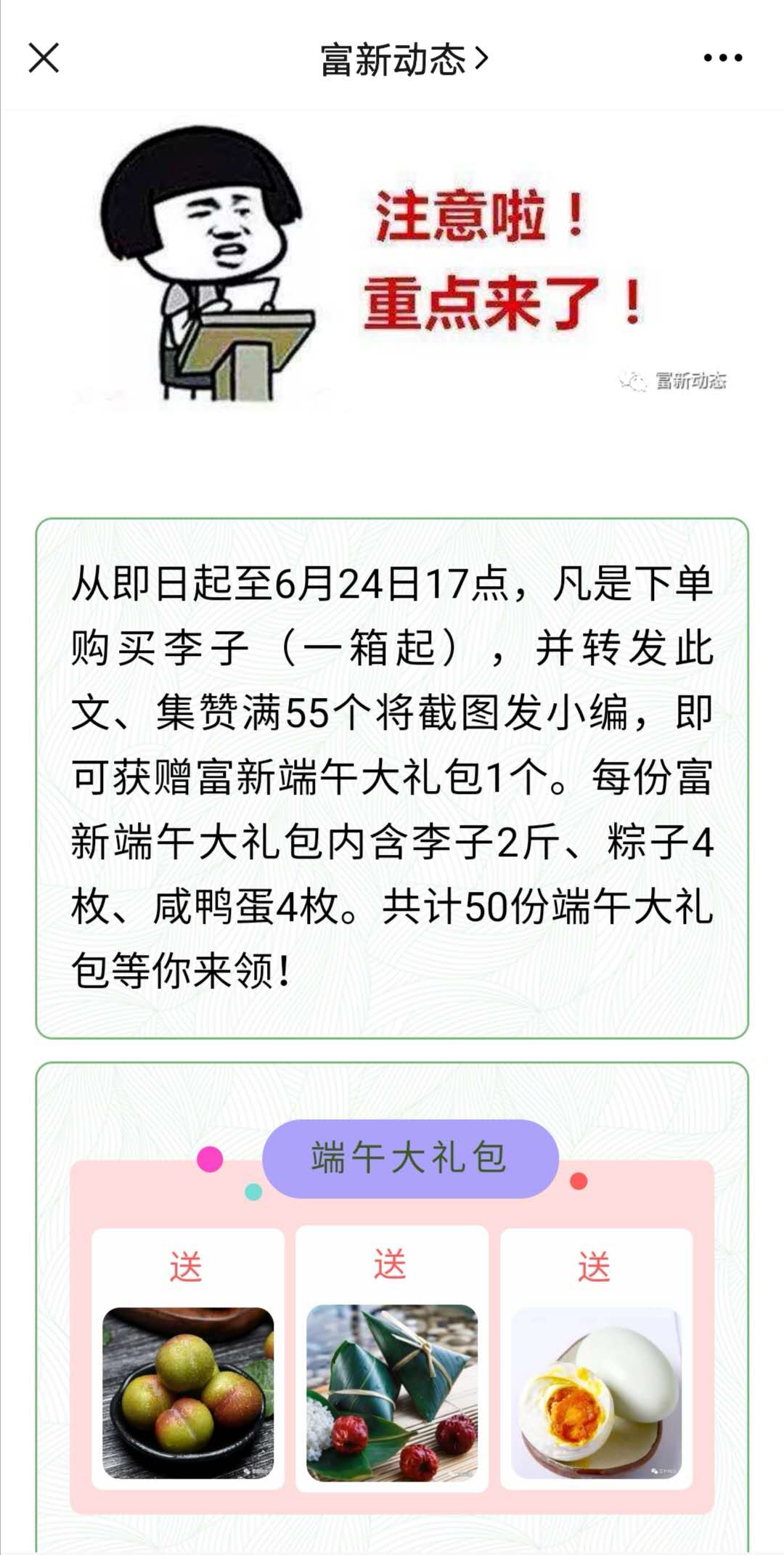 端午节期间,为让大家深入了解富新好“李”,促进消费扶贫,富新镇工会联合会通过微信公众号,特别推出“购富新好‘李’,送端午大礼包”活动,吸引全县广大职工群众购买富新镇出产的五月脆、江安李、半边红等品种李,帮助果农促销李子。
