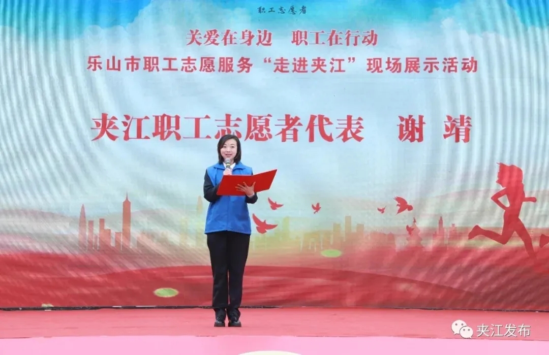 在职工志愿服务队授旗仪式上,与会领导为夹江县漹城街道、青衣街道、新场镇、甘江镇、木城镇、黄土镇、吴场镇、马村镇、华头镇和夹江爱心志愿者职工志愿服务队授旗。职工志愿者代表谢靖宣读了《乐山市深化职工志愿服务倡议书》。