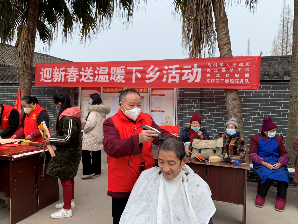 当天上午,在热闹的村委会,县总工会组织职工志愿者服务队为来往的群众、农民工开展免费理发、赠送春联、赠送“福”字、写对子、体验夹江年画印制等志愿服务活动,现场为他们发放有关疫情防控、健康文化知识、《劳动法》及各类惠民宣传手册,宣传“三农”工作和乡村振兴政策。通过一系列的志愿服务,让他们感到格外暖心。