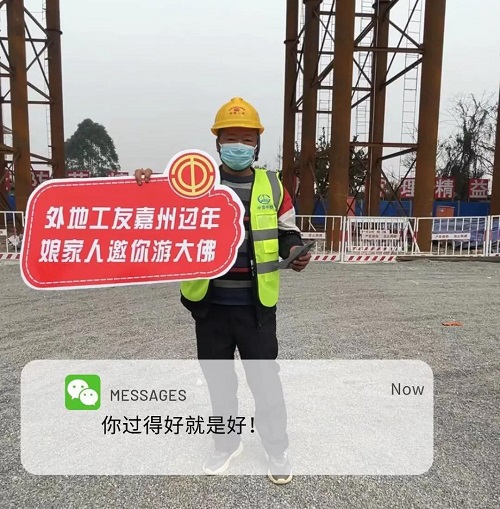 乐山市市中区总工会常务副主席朱冰为在“嘉”就地过年的企业职工代表赠送景区门票,让大家真正“留得下、过好年”。