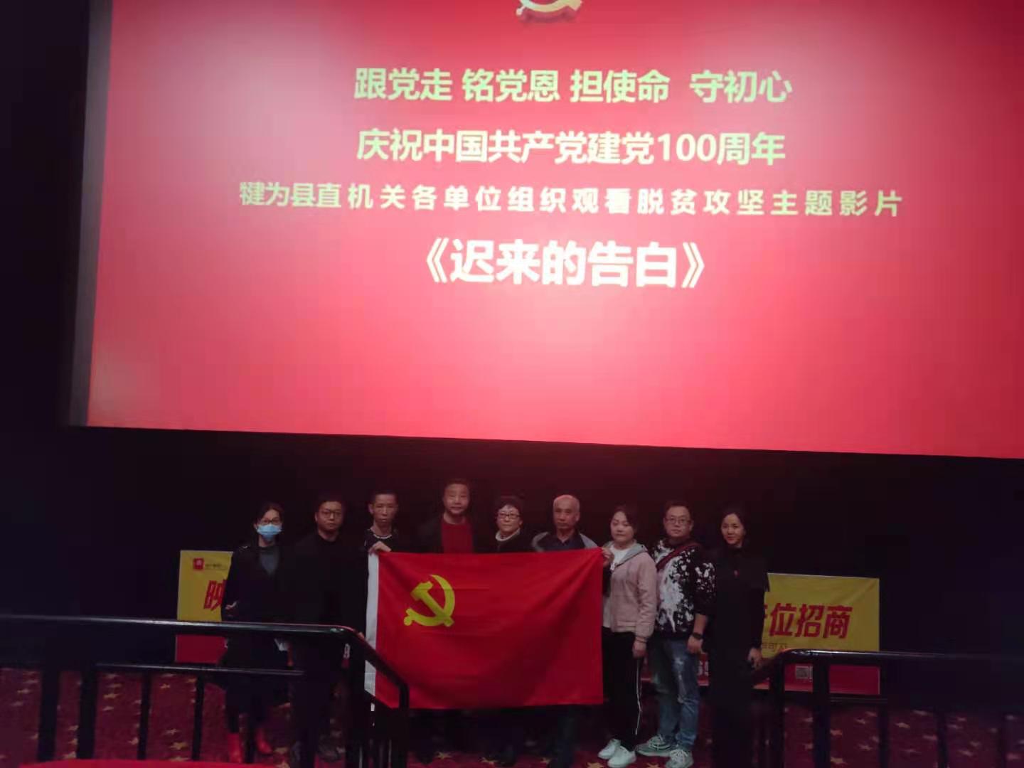 犍为县总工会不断丰富党史教育形式,将党史学习教育与脱贫攻坚相结合。4月8日下午,县总工会组织全体党员到横店电影城观看红色教育电影《迟来的告白》。