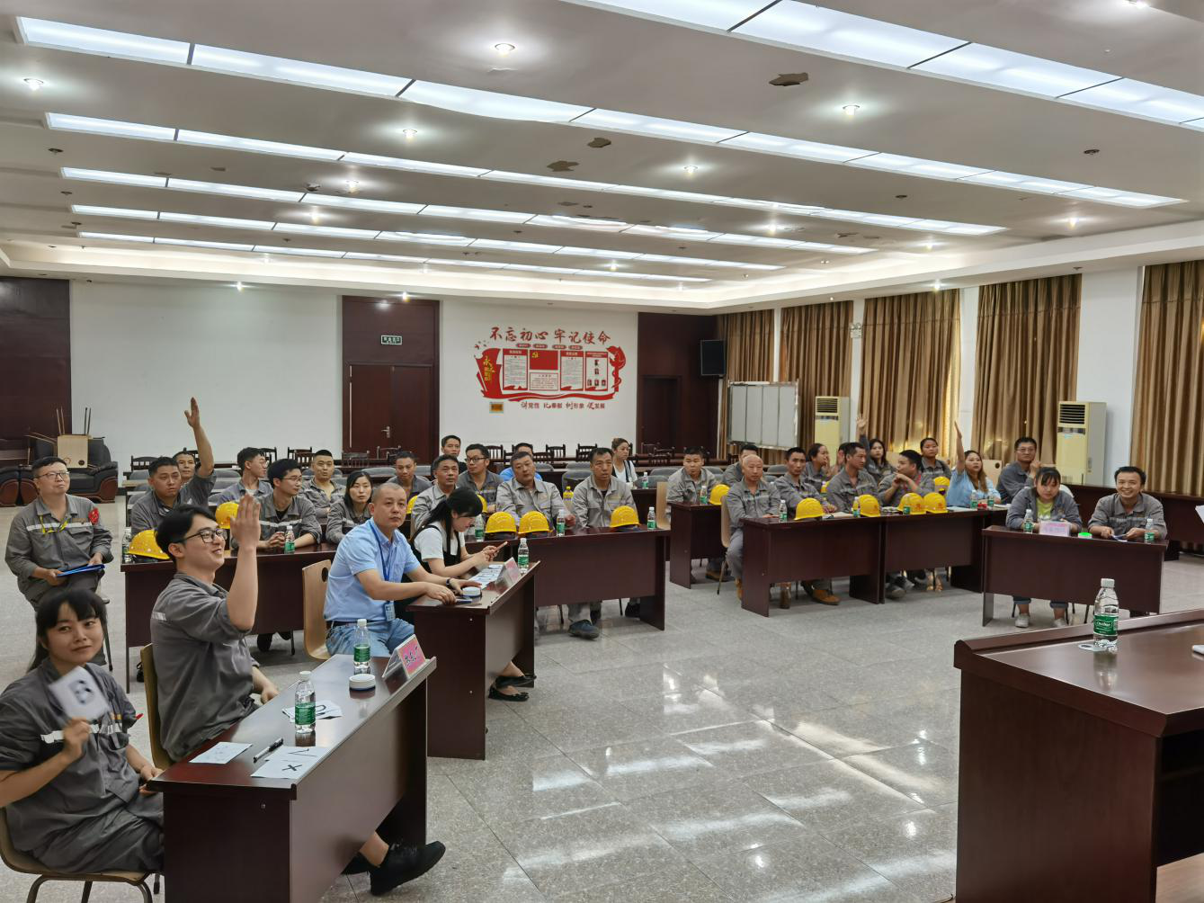 2号选手请听题:“发生液氨储罐氨气泄漏事故,如何应急处置?”“立即佩戴自给正压式呼吸器,穿防重型防化服,从就近的安全出口撤离。”4号选手请听题:“请简述消防安全四个能力?”“检查火灾隐患的能力、疏散自救能力、扑救初期火灾的能力及教育宣传培训的能力。”比赛采用个人必答、抢答和集体必答、抢答的方式展开,各参赛队通过各显身手、争分夺秒、齐心协力、决战决胜等四个环节的激烈角逐,最终炼钢队勇夺第一名,热轧队、行政后勤队、设备物资品管联队分别获得二、三、四名。另外,赛事专门设置了观众题。