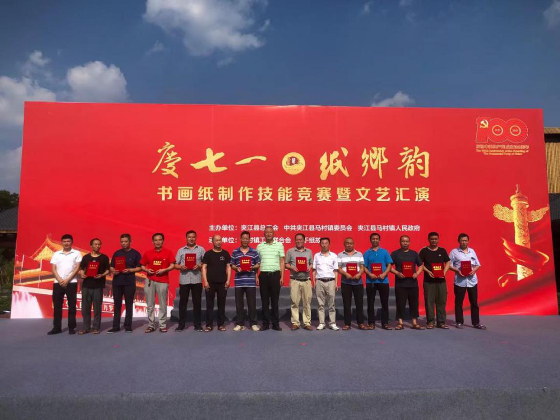 为传承和弘扬国家非遗——夹江竹纸制作技艺,助推夹江书画纸产业发展,建设巴蜀文化旅游走廊研学游基地,助力打造乐山旅游第三极,促进文旅融合发展,打造马村“纸韵小镇”,为建党100周年献礼,6月29日,由夹江县总工会、马村镇党委政府联合主办的“庆七一.纸乡韵”书画纸制作技能竞赛在国家3A级旅游景区——马村镇大千纸故里成功举行。县级相关部门、马村镇党员干部职工、周边群众及社会各界人士近500人参加此次比赛开幕式。