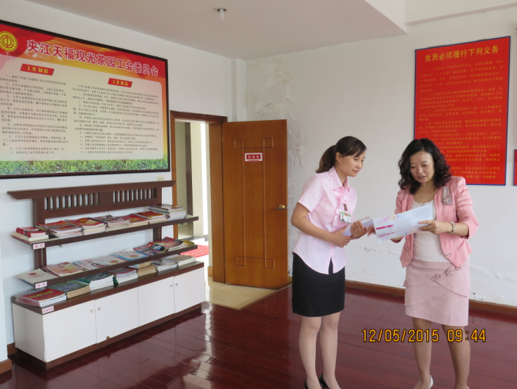 2015年5月12日,乐山市总工会副主席兰宁和经保女工部副部长古民,到夹江天福观光茶园有限公司就“职工心灵驿站”、“农民工文化驿站”、“妈咪宝贝屋”和“职工书屋”的建设工作进行了调研。在调研会上天福观光茶园工会主席彭芳就“职工心灵驿站”、“妈咪宝贝屋”和“职工书屋”的建设作了汇报,“职工心灵驿站”成立以来,已经进行了心理咨询16例,其中情绪情感12例、恋爱婚姻家庭1例、人际关系2例、工作方式1例,在正面引导情绪、舒缓员工压力方面发挥了积极作用。夹江县总工会副主席贾利蓉、女工委主任刘丽萍等陪同参加了调研。