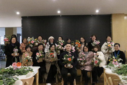 下午的插花活动现场芬芳四溢、气氛温馨。花艺老师讲解了花卉的品种、特性、花语及不同的插花手法花卉色彩搭配等基本技巧并现场演示插花。大家在花艺老师的指导下动手尝试修剪枝叶制作插花作品,经过精心的修饰一件件令人赏心悦目的作品制作完成,最后大家捧着美丽的花束开心地留下了合影。