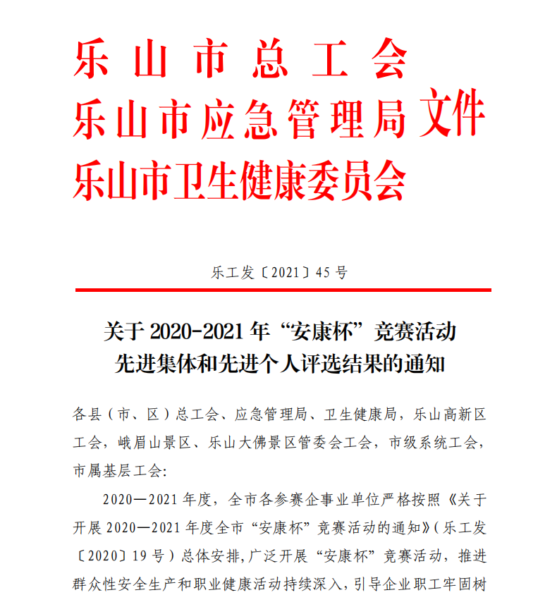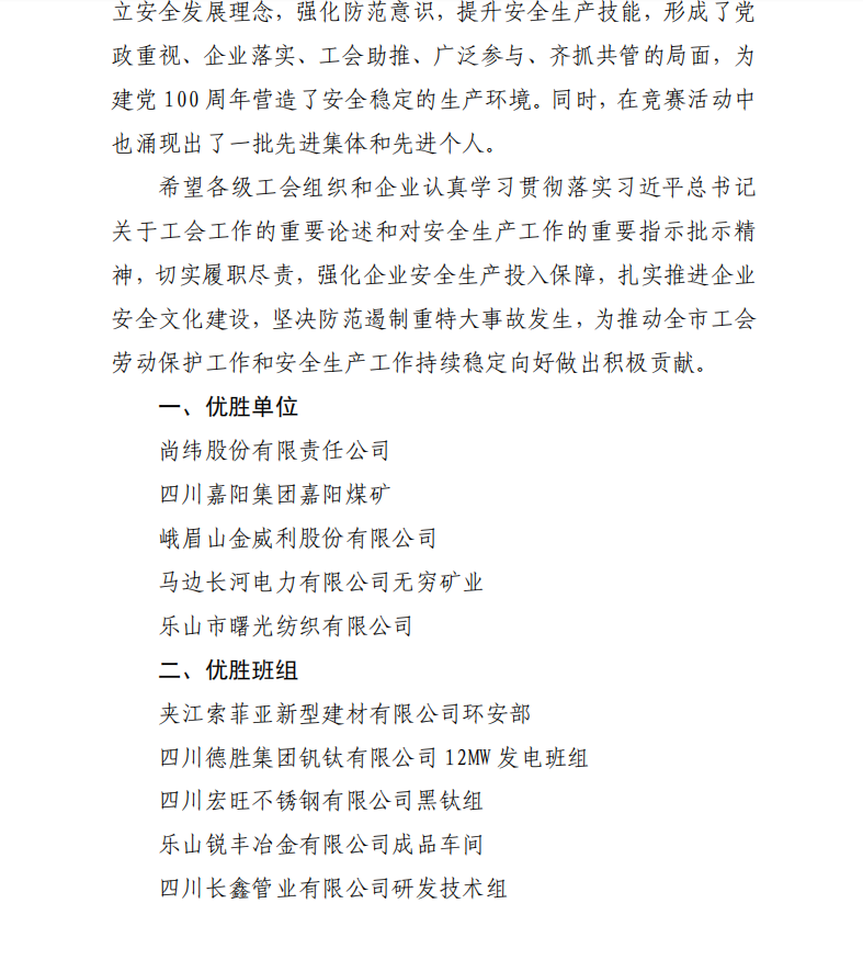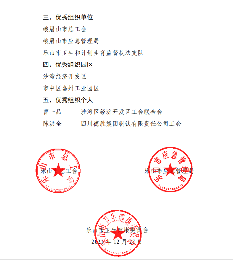 12月27日,乐山市总工会联合乐山市应急管理局、乐山市卫生健康委员会以乐工发〔2021〕45号文,对全市2020-2021年“安康杯”竞赛活动的先进集体和先进个人进行通报表彰。沙湾经济开发区评选为优秀组织园区,四川德胜集团钒钛有限公司12MW发电班组、四川宏旺不锈钢有限公司黑钛组、四川长鑫管业有限公司研发技术组评选为优胜班组,沙湾经济开发区工会联合会主席曹一品、四川德胜集团钒钛有限责任公司工会委员陈洪全评选为优秀组织个人。
