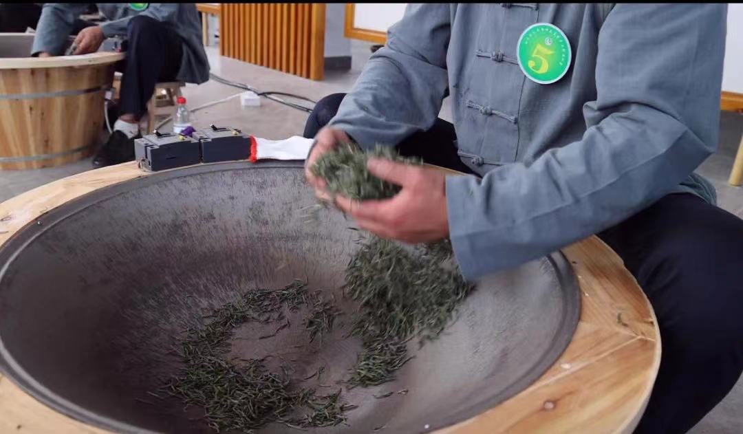 在牛郎坪茶叶现代农业园区综合服务中心比赛现场,四周围满了前来观看比赛的群众,参赛选手有条不紊地整理制茶工具,为比赛做足充分准备,现场气氛热烈。随着比赛开始,参赛选手动作娴熟,将筛选好的茶叶倒进锅里进行杀青,只见选手们手贴茶叶,手法熟练地翻炒茶叶,趁热对茶叶进行揉捻。经过炒制、揉捻、做形、烘干等工序后,原来青翠的鲜叶渐渐变干,一锅又一锅手工炒制的茶叶新鲜出炉,现场顿时茶香四溢,沁人心脾。