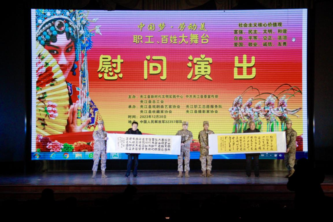 近日,在元旦佳节即将到来之际,夹江县新时代文明实践中心、县委宣传部、县总工会、县退役军人事务局携手县文联下属四个协会以及夹江职工志愿服务队走进中国人民解放军驻夹某部队,开展“中国梦·劳动美”职工、百姓大舞台公益慰问演出活动,为人民子弟兵送上慰问物资,并开展志愿服务。